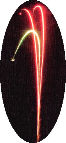 点火すると、明るい緑の星2個と鮮やかな紅星が1個が輝くような残像を残し上空高く打ち上がります。星が合計3個、高さ約25mの高さに打ち上がります。