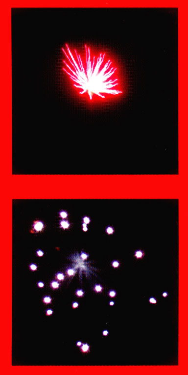 丸玉が上空に約25m打ち上がり、小気味よい開発音と共にたくさんの赤星、銀錦星、音星が四方八方に飛び散り大きく開花します。そしてバリバリと炸裂します。
