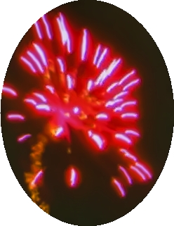 牡丹には最初の「引き」となる火薬層がなく、爆発直後から特定の色(紫であれば、紫の光を発する星)を出して爆発の勢いで花弁の外へ飛んでいきます。